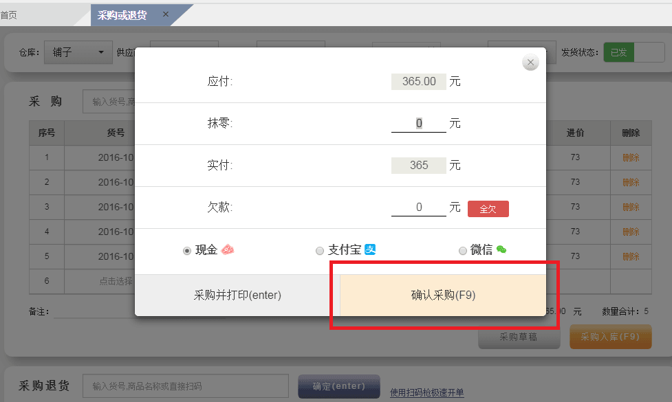 3、商品创建好以后,就可以去采购进货了。根据提示进入采购页面,在输入框中输入货号或商品名称——填写数量(或连接扫码枪直接扫码)——点击采购入库——确认采购,商品就采购成功了。)